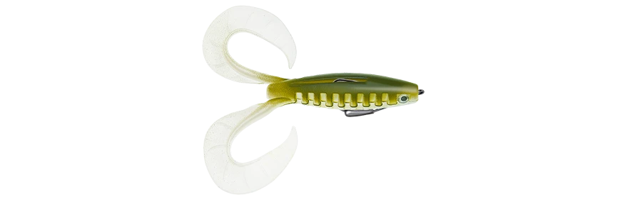 Dit Nieuwe kunstaas met dubbele staart van 12 cm is gemonteerd klaar om te vissen met een verzwaarde Texas haak systeem verzwaard met 7 gram , zowel in ondiepe gebieden op zoek naar snoek als in de lagere waterlagen om snoekbaars en grote baars te volgen. Inderdaad, zijn zeer flexibele dubbele staart is altijd in beweging, zelfs bij zeer lage snelheid, wat roofdieren niet onverschillig maakt. Door zijn weedless montage kan hij door de meest overbelaste omgevingen gaan zonder vuil te vangen. Door de brede spleet kan de Texaan perfect naar buiten komen tijdens de beet om zo een perfecte penetratie te garanderen.