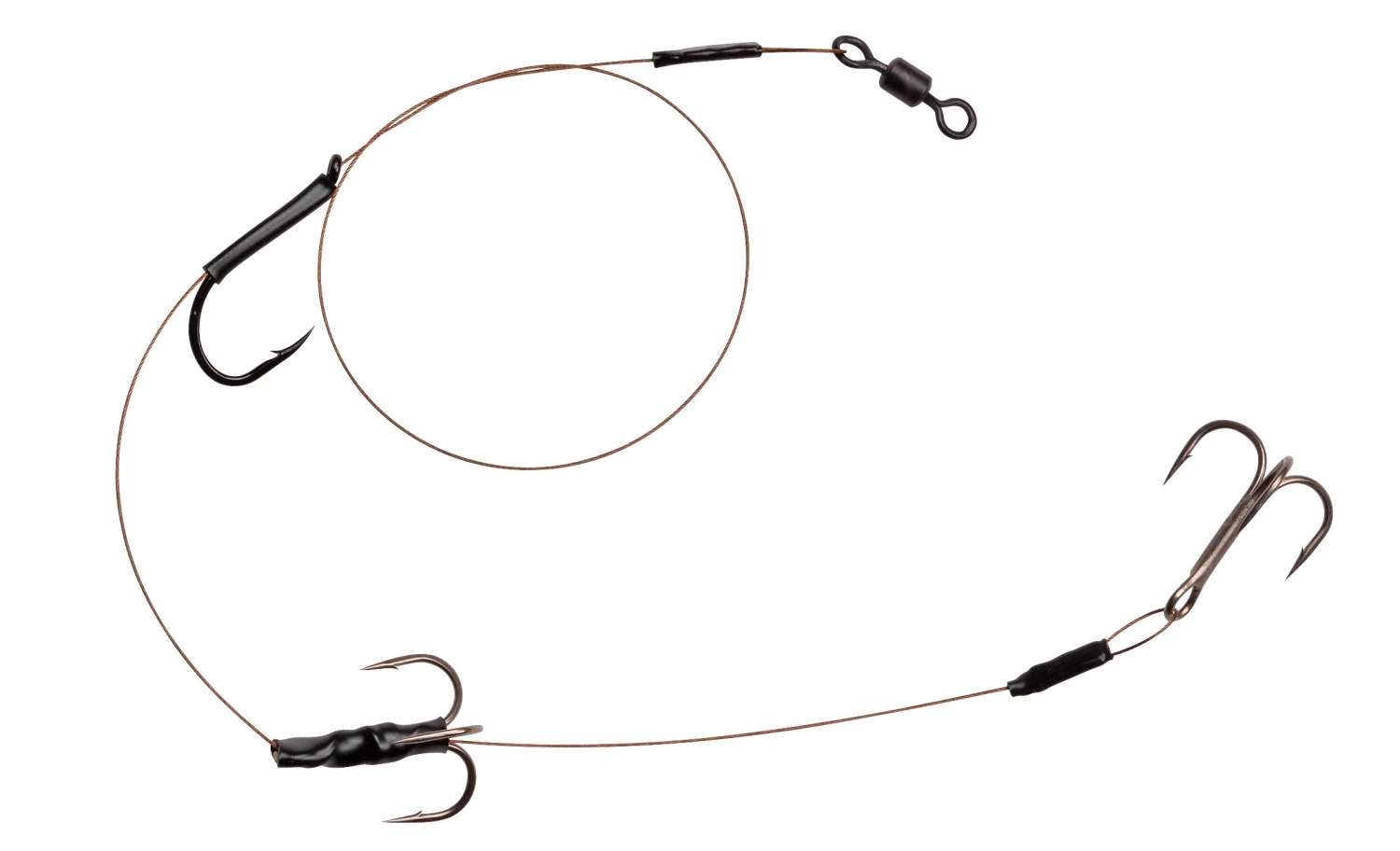 Topkwaliteit aasvis-rig, gemaakt van camouflage bruin AFW ( American Fishing Wire ) in 7×7 RVS. De 1100 serie is gemaakt met 2 vaste Gamakatsu dreggen en een enkele schuivende haak ( t.b.v. neus of staart-haak bevestiging ). Uitstekende rig voor grotere aasvissen. De rig is keurig afgewerkt met krimpkousjes.